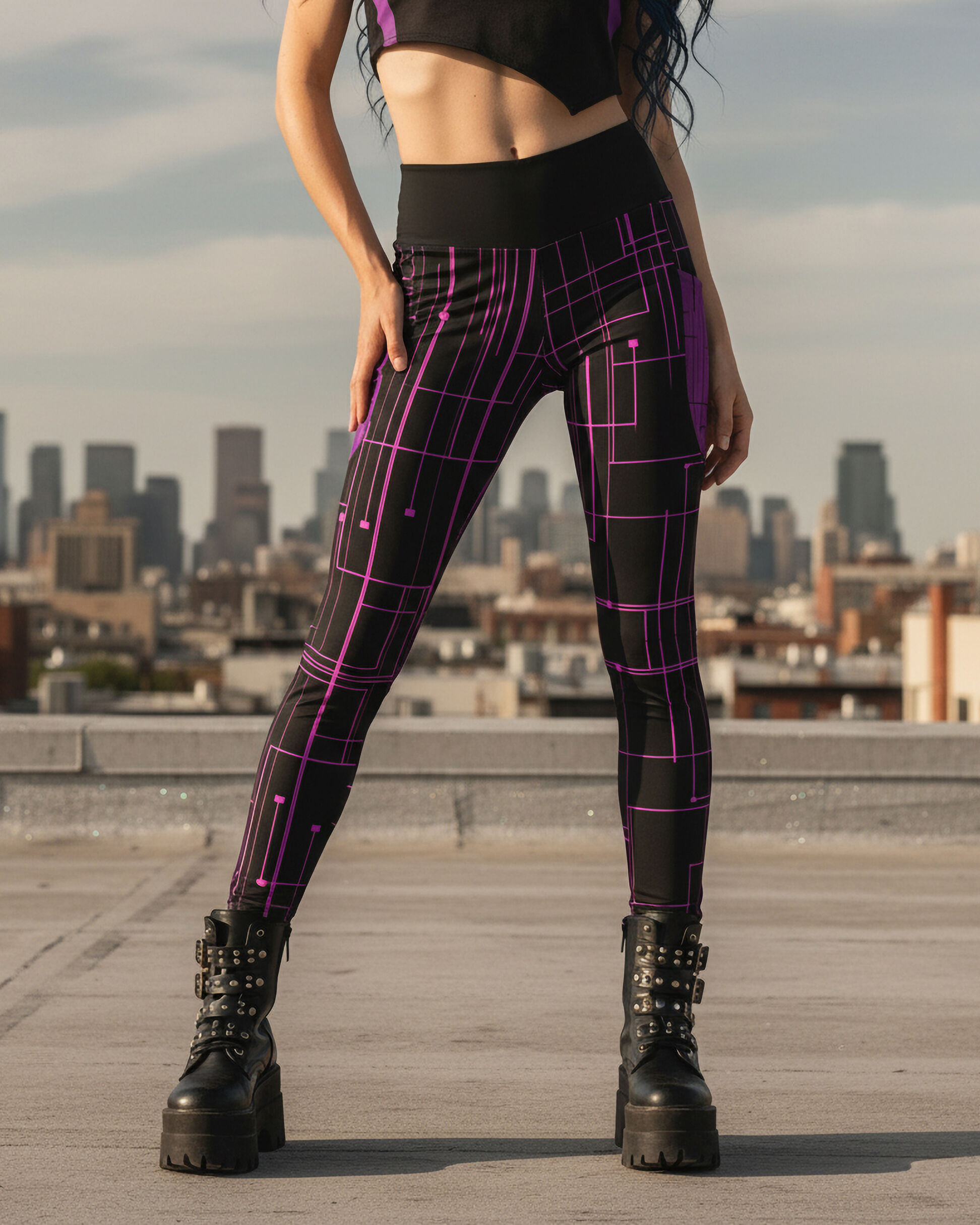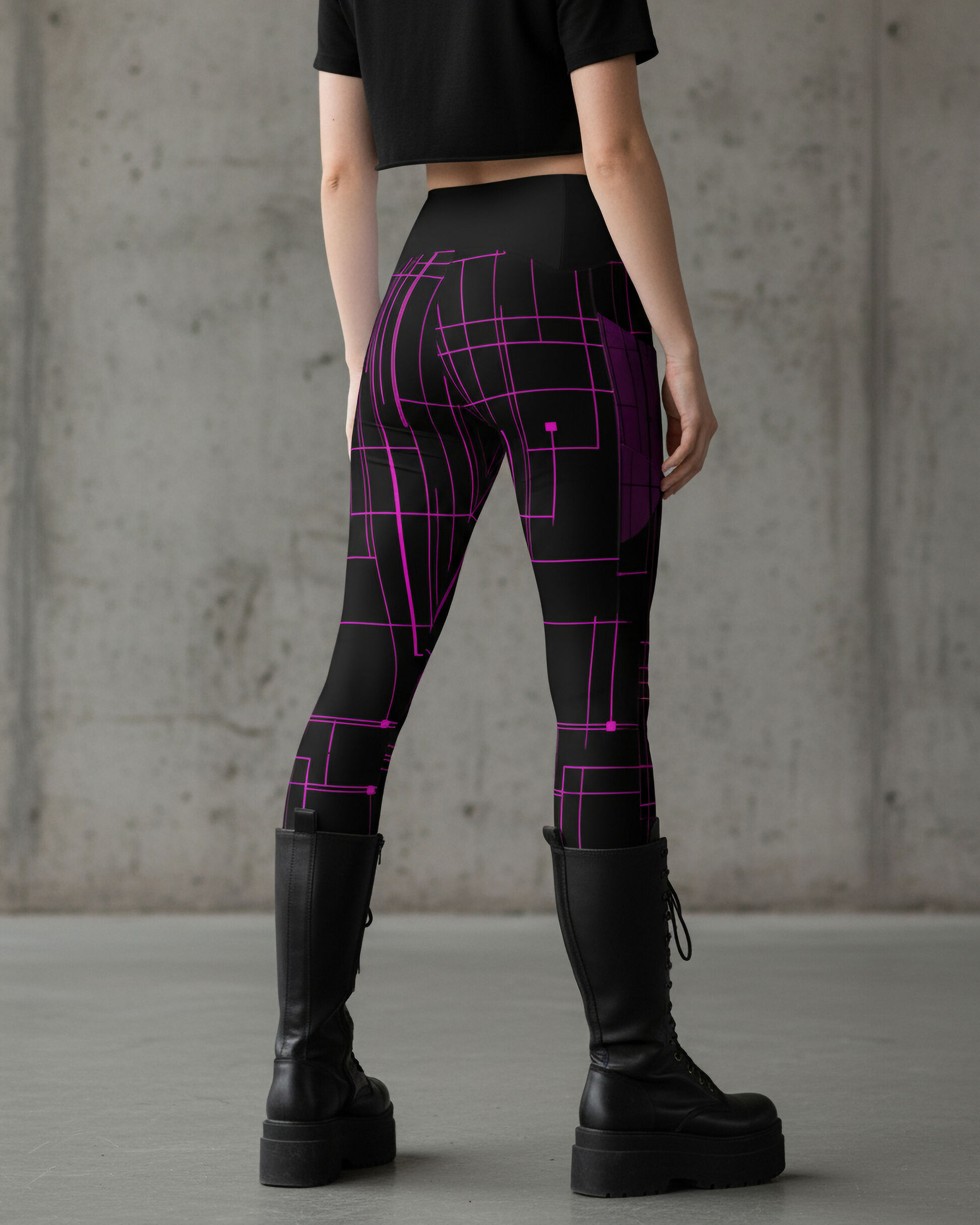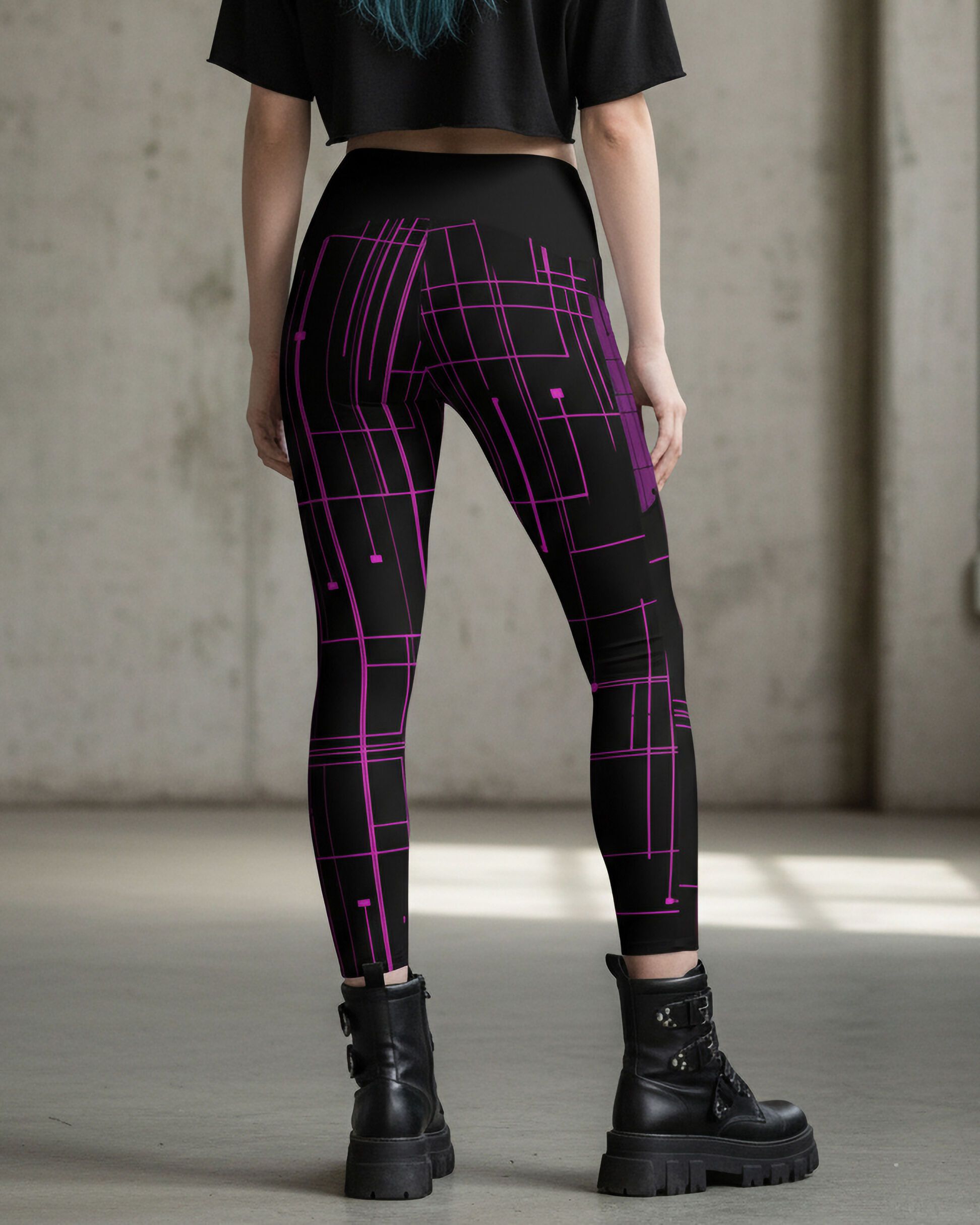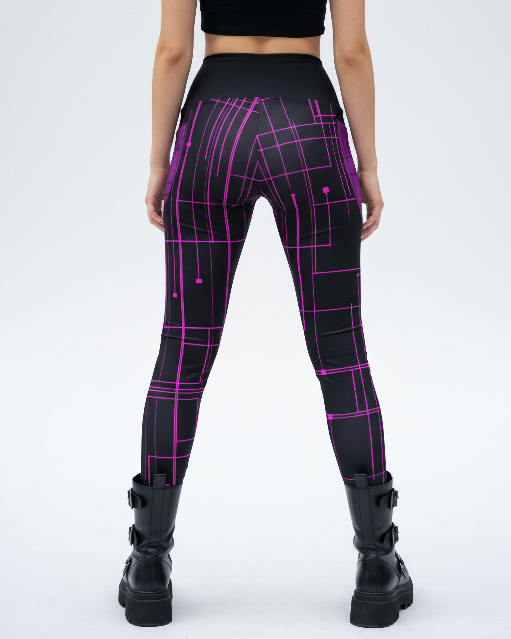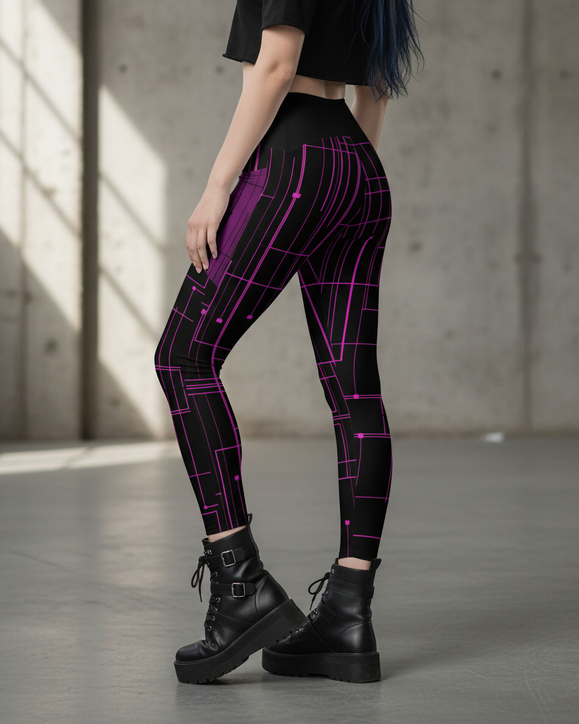 Step into the future with the Pink Circuit Futuristic Leggings — inspired by digital circuit aesthetics and urban innovation. The vibrant magenta circuit-line pattern over a deep black base creates a striking balance between edgy streetwear and sleek performance wear.