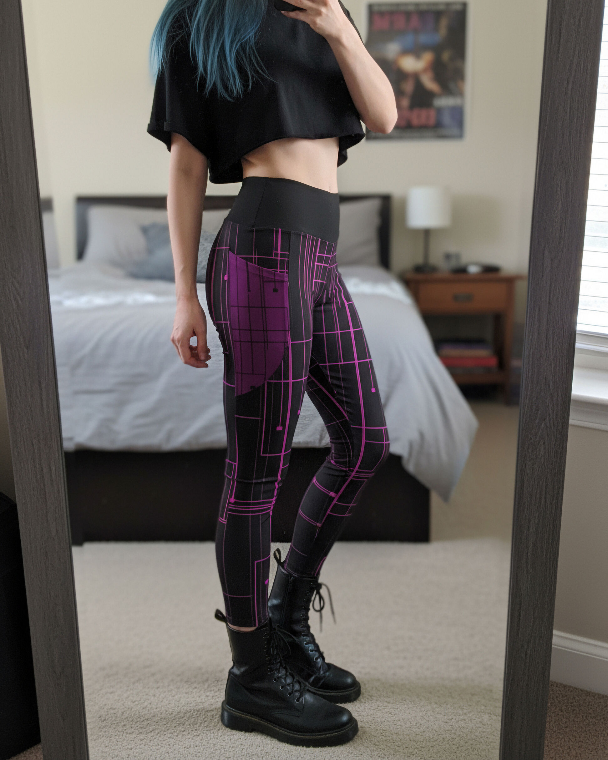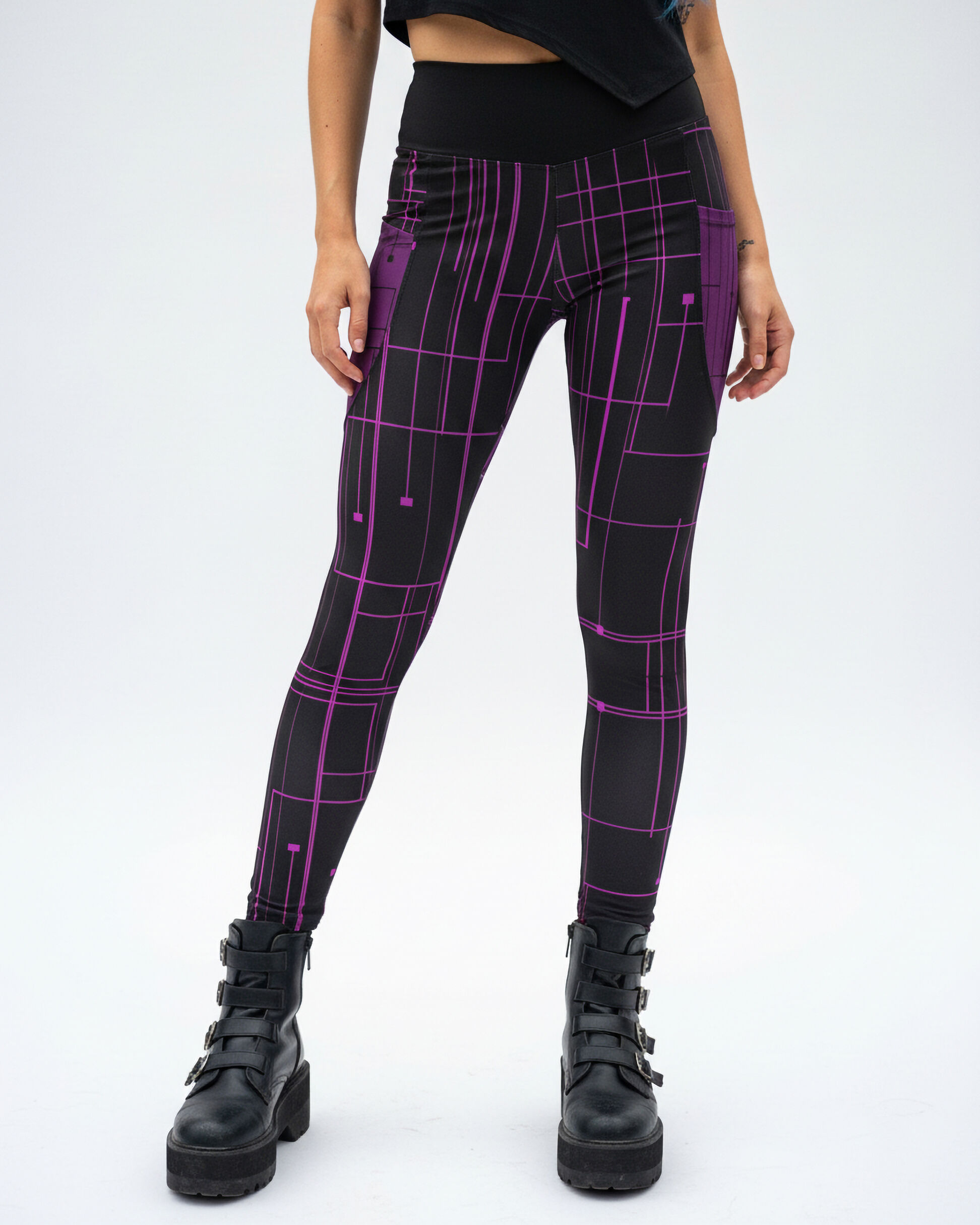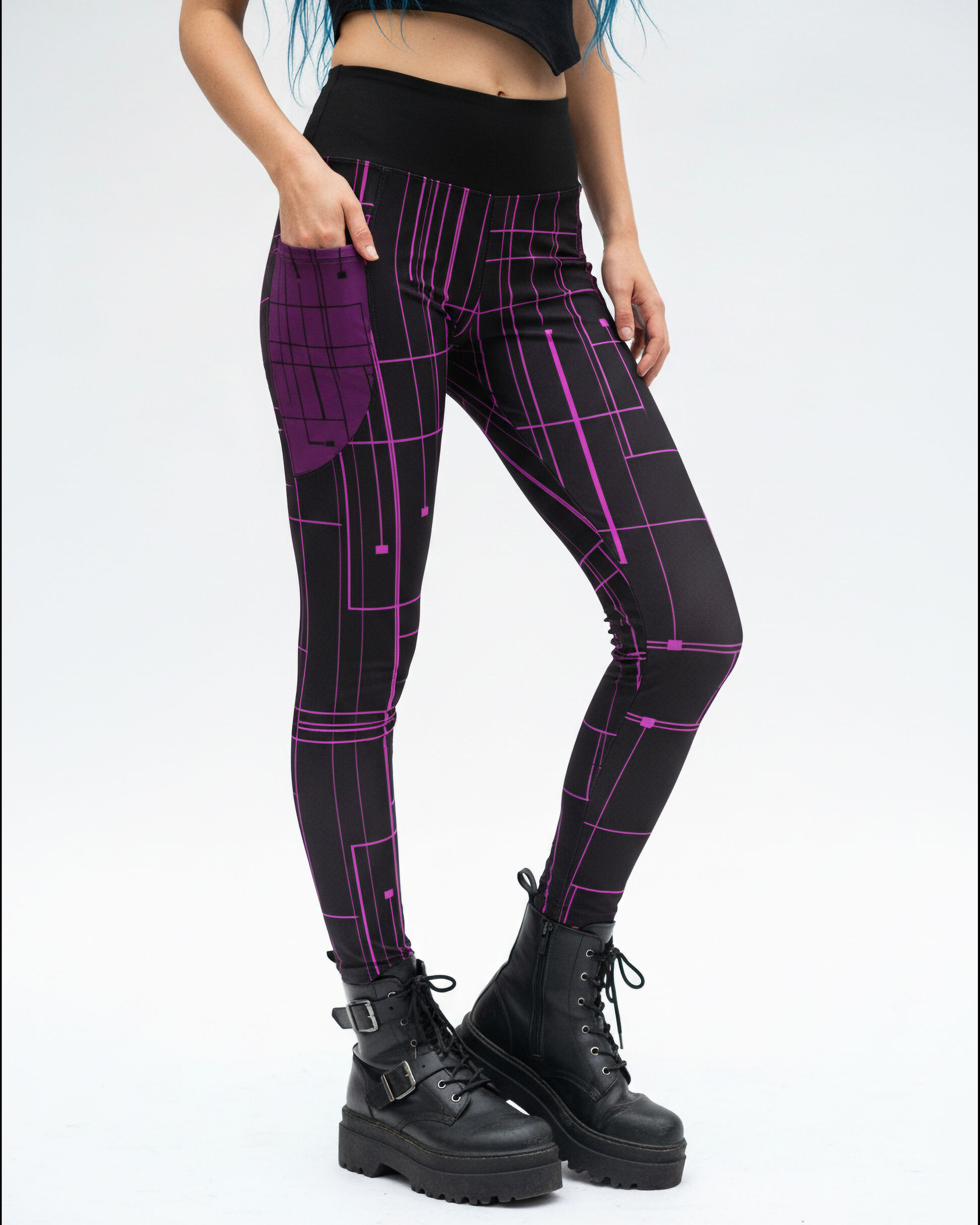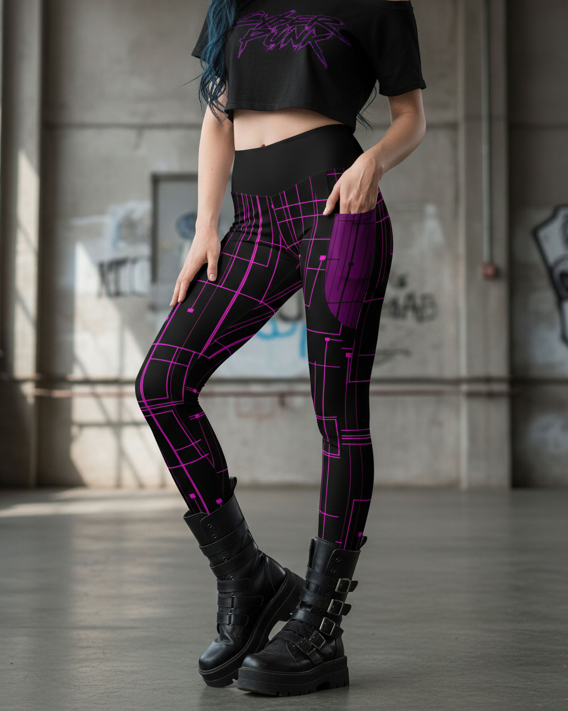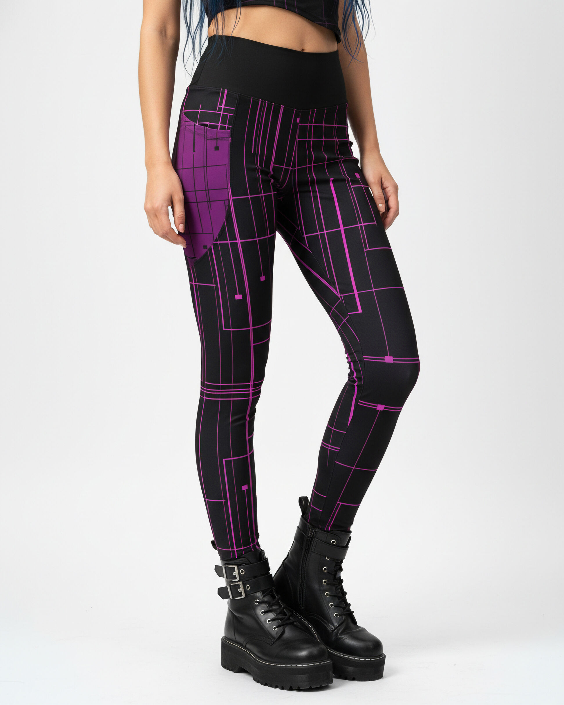 Step into the future with the Pink Circuit Futuristic Leggings — inspired by digital circuit aesthetics and urban innovation. The vibrant magenta circuit-line pattern over a deep black base creates a striking balance between edgy streetwear and sleek performance wear.